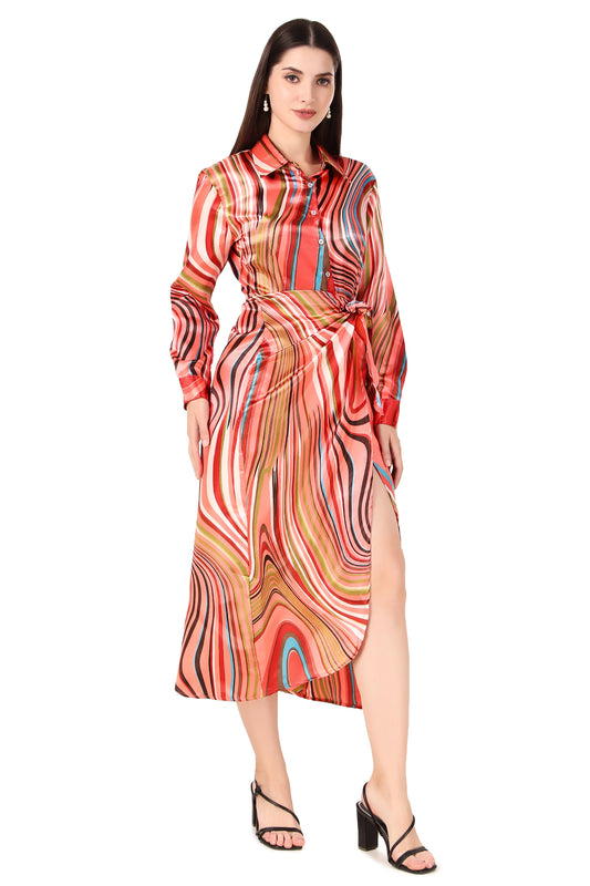 BoheeWohee Soft Satin Shirt Midi Dress- Printed Pink