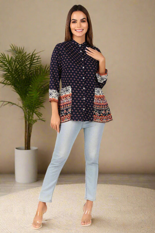 BoheeWohee Top Navy Blue Printed Women's Shirt. You'll love it!