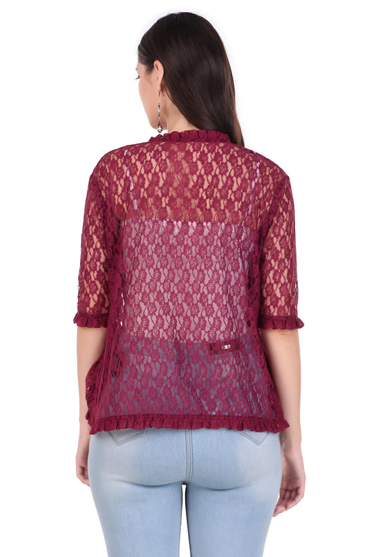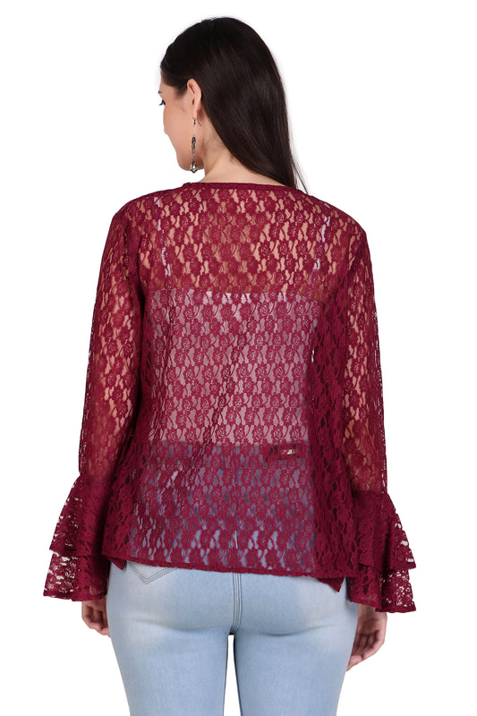 BoheeWohee Women's Floral Self Design Lace Shrug with Double Bell Sleeves- Aubergine