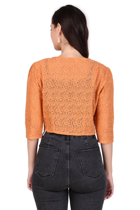 BoheeWohee Women's Floral Self Design Lace Shrug with Double Bell Sleeves-Orange