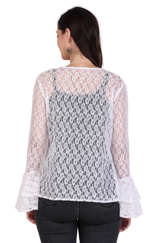 BoheeWohee Women's Floral Self Design Lace Shrug with Double Bell Sleeves-White