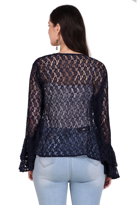 BoheeWohee Women's Floral Self Design Lace Shrug with Double Bell Sleeves- Navy