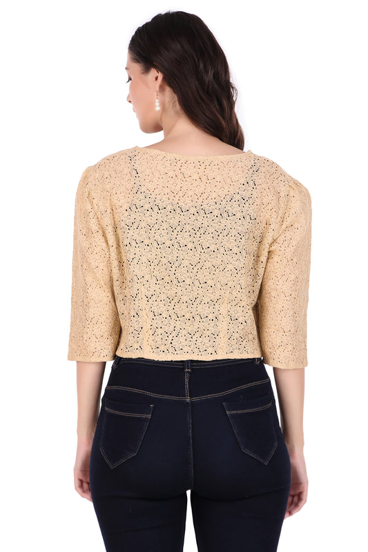 BoheeWohee Women's Floral Self Design Lace Shrug with Double Bell Sleeves- Almond