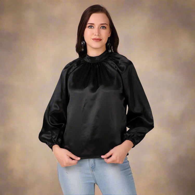 A beautiful satin top for women or girls with a band collar and elasticated sleeve ends combines elegance and comfort. The satin top fabric gives it a luxurious stylish shine and smooth texture, perfect for both formal and semi-formal occasions. The band collar of women satin top adds a sharp, tailored touch, giving the t-shirt/top a structured look. The elasticated sleeve ends provide a relaxed, stylish fit while allowing flexibility and ease of movement. This design for ladies top for women is ideal for pairing with both trousers and skirts, offering versatility for different looks, whether worn tucked in or left out. The soft drape of the satin further enhances its timeless appeal.