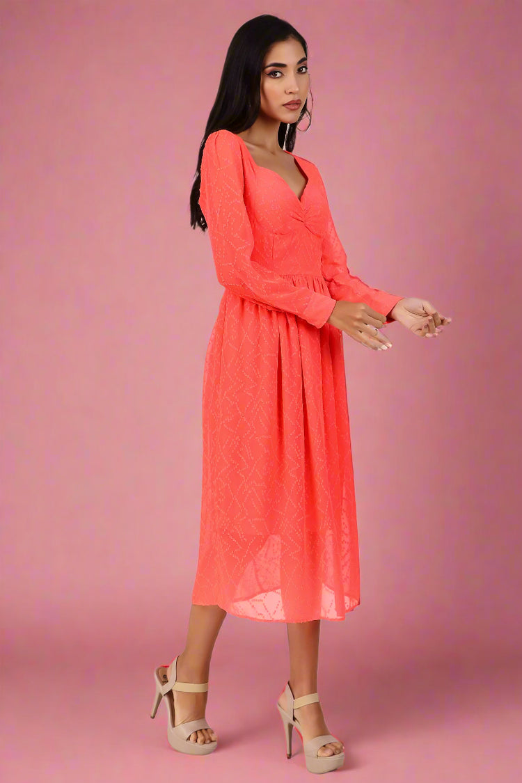 Chiffon Dress with Sweetheart Neckline and Long Sleeves - Red