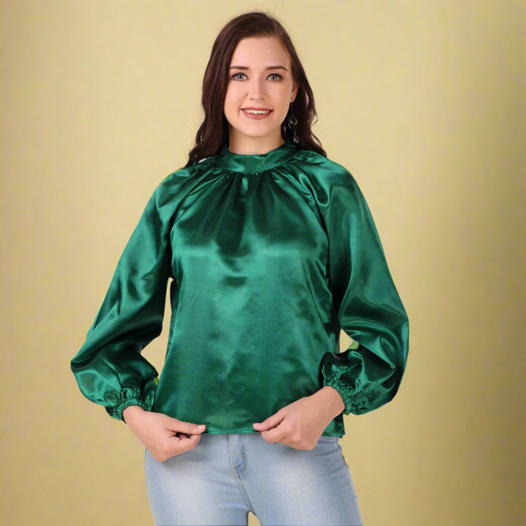 A beautiful green satin top for women or girls with a band collar and elasticated sleeve ends combines elegance and comfort. The satin top fabric gives it a luxurious stylish shine and smooth texture, perfect for both formal and semi-formal occasions. The band collar of women satin top adds a sharp, tailored touch, giving the t-shirt/top a structured look. The elasticated sleeve ends provide a relaxed, stylish fit while allowing flexibility and ease of movement. This design for ladies top for women is ideal for pairing with both trousers and skirts, offering versatility for different looks, whether worn tucked in or left out. The soft drape of the satin further enhances its timeless appeal.