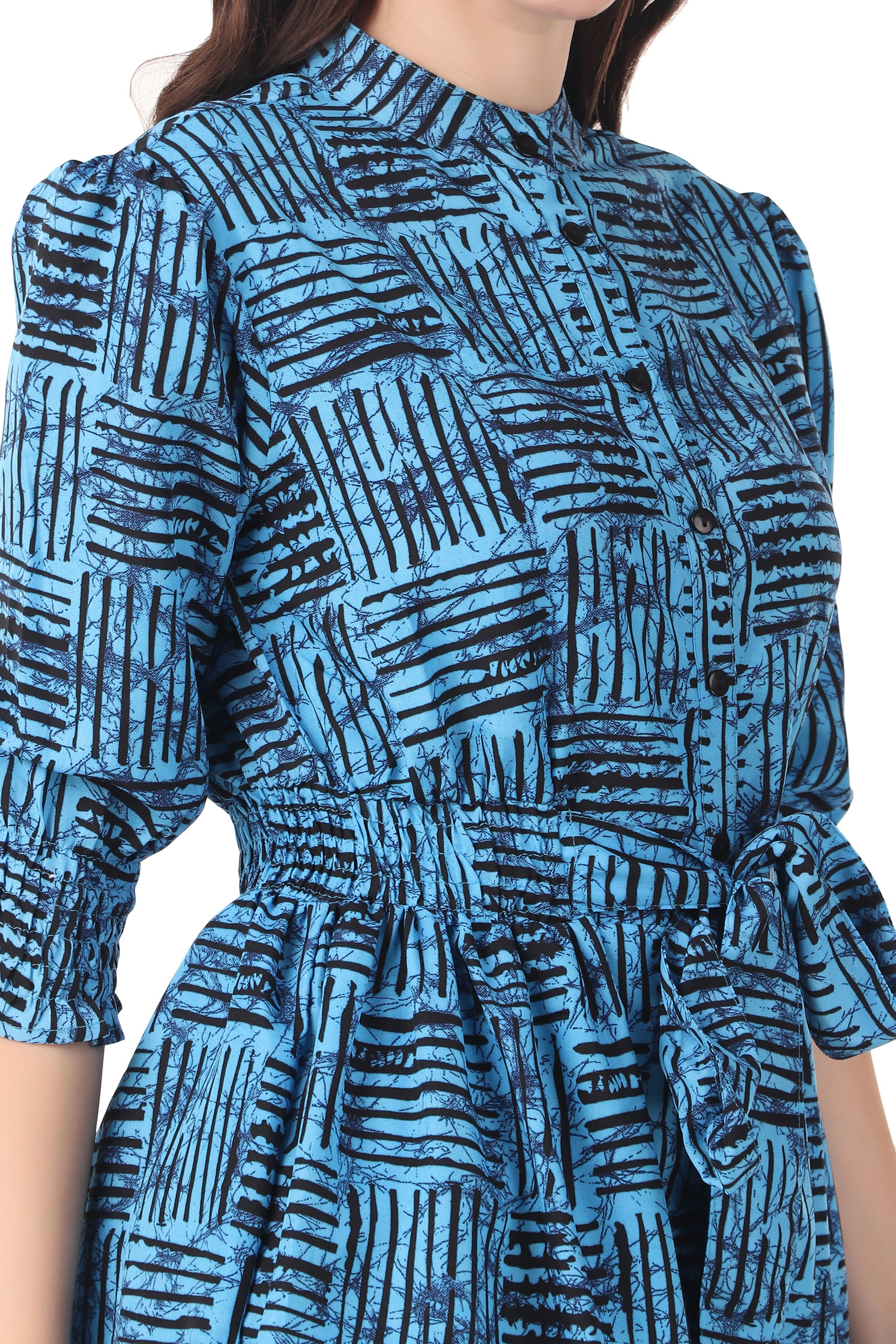 Midi Dress with Elastic Waist & Front Tie Belt- Danube Blue