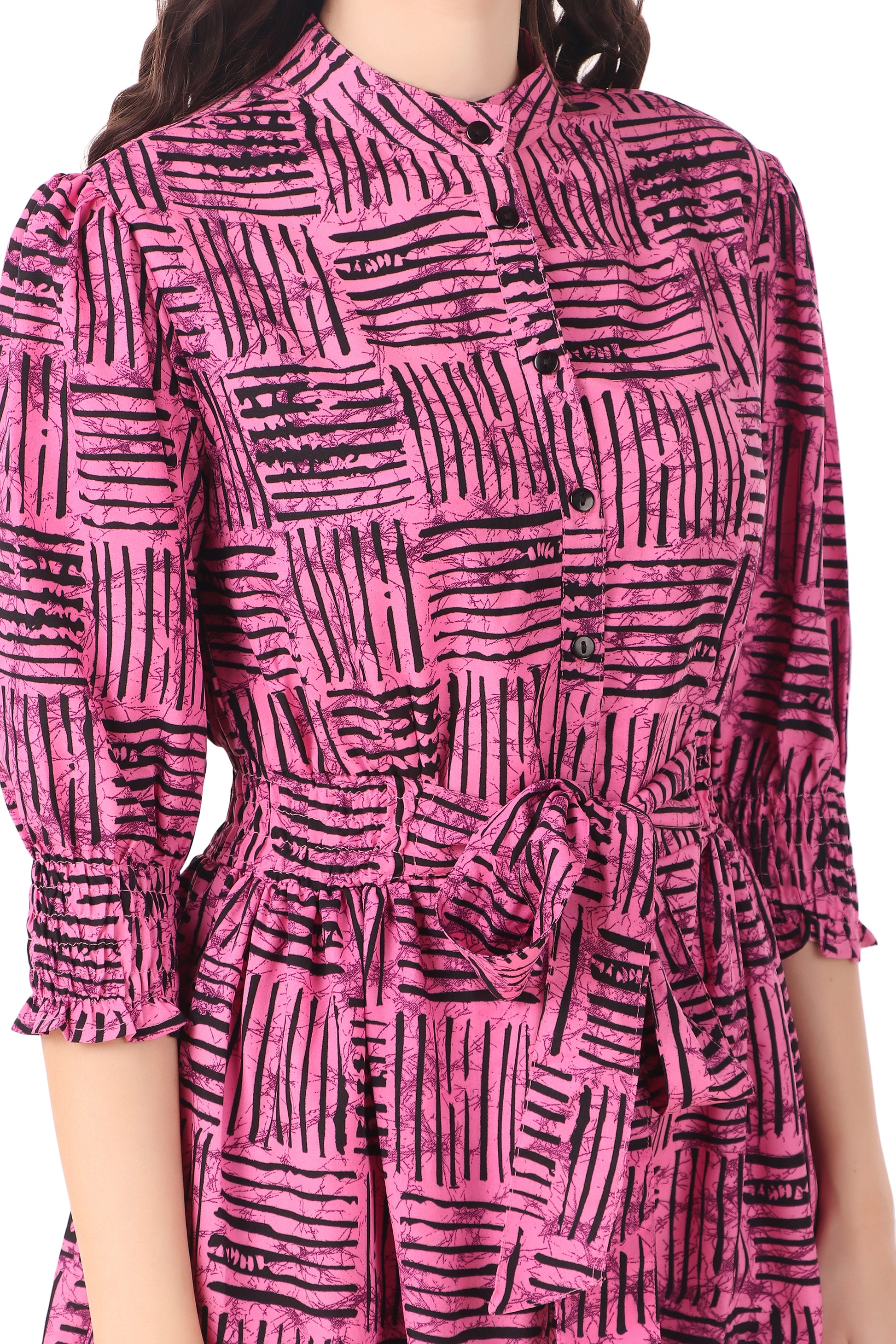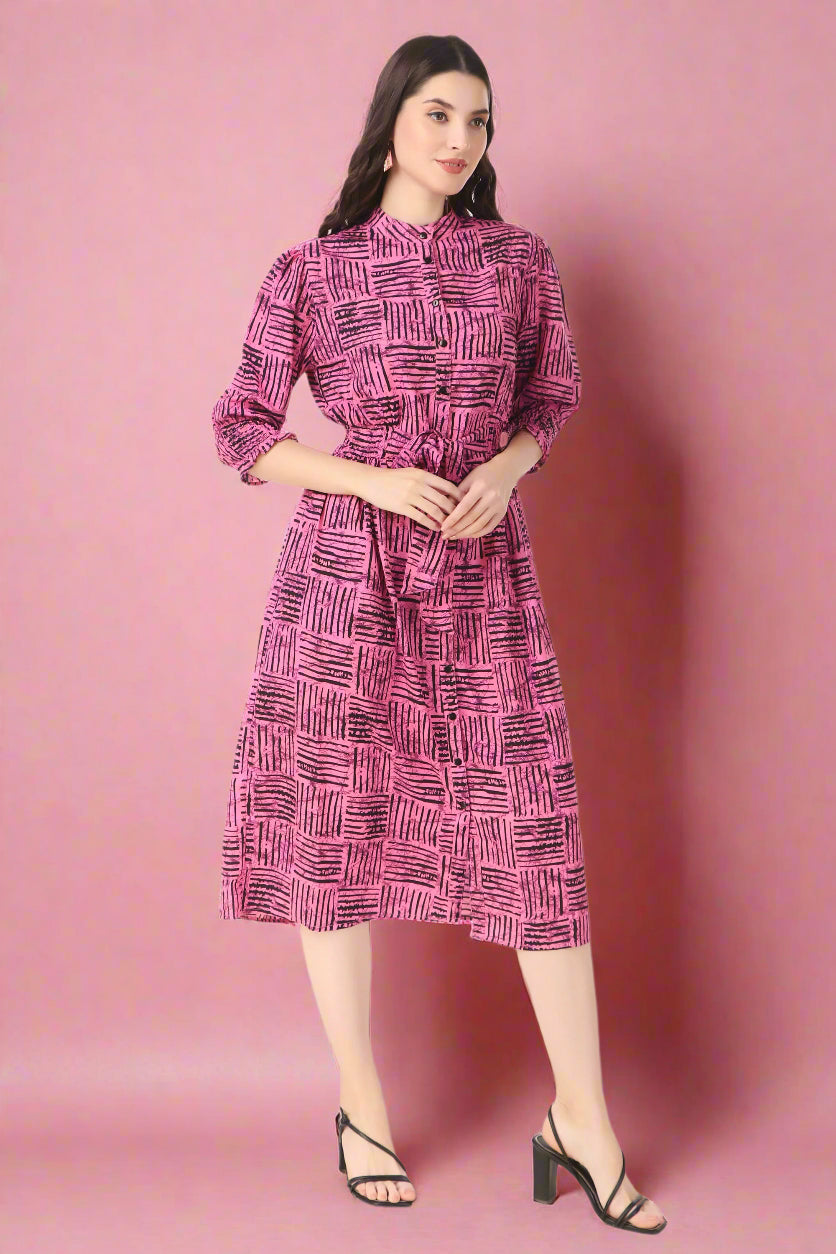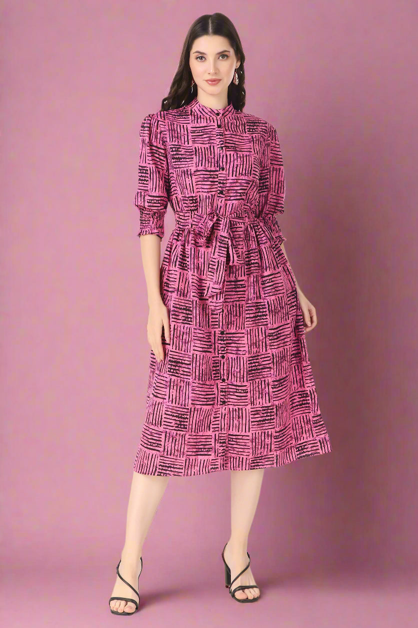 Midi Dress with Elastic Waist & Front Tie Belt- Carnation Pink