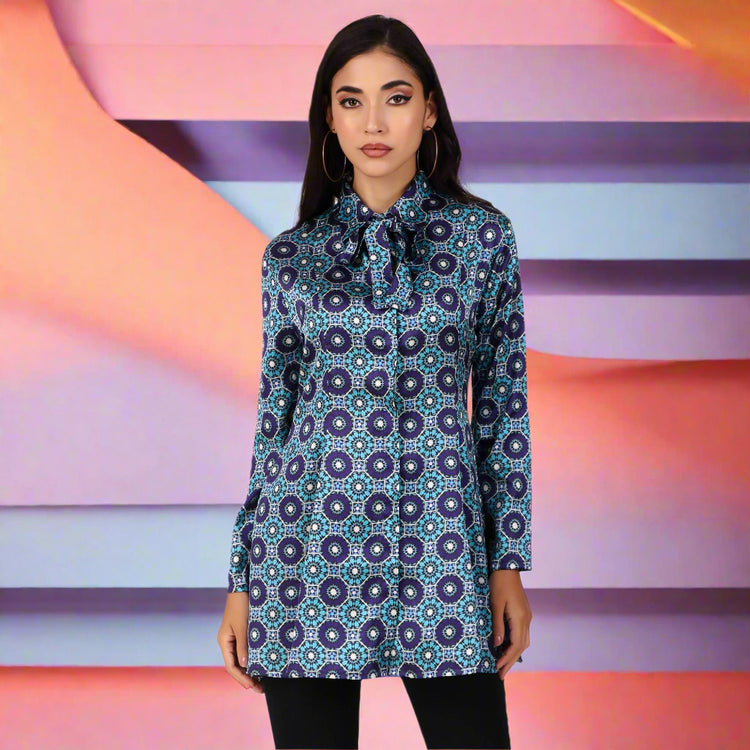 1. Elevate your casual wardrobe with the BoheeWohee Casual Women's satin Top, a stunning tunic that embodies effortless elegance. This long-sleeved, midi-length button-up shirt showcases a distinctive geometric, circular pattern in teal, dark blue, and white tones, making it a standout piece for any occasion. The high, notched collar and bow-tie style add a sophisticated flair, while the luxurious satin fabric ensures a soft, sumptuous feel against the skin.